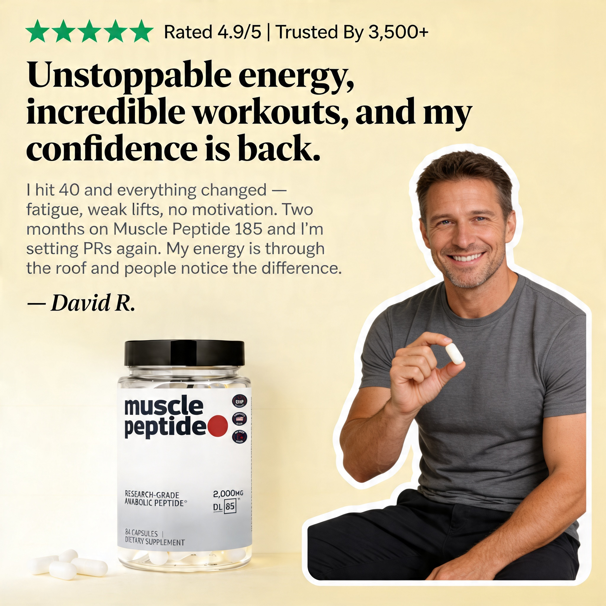 After 30, testosterone drops 1-2% yearly. Result? Muscle growth stalls, recovery drags, strength plateaus, and belly fat accumulates despite hard training. Low Testosterone kills your gains, energy, and confidence. Muscle Peptide 185 supports healthy testosterone levels so your body can finally build the lean muscle you're working for.